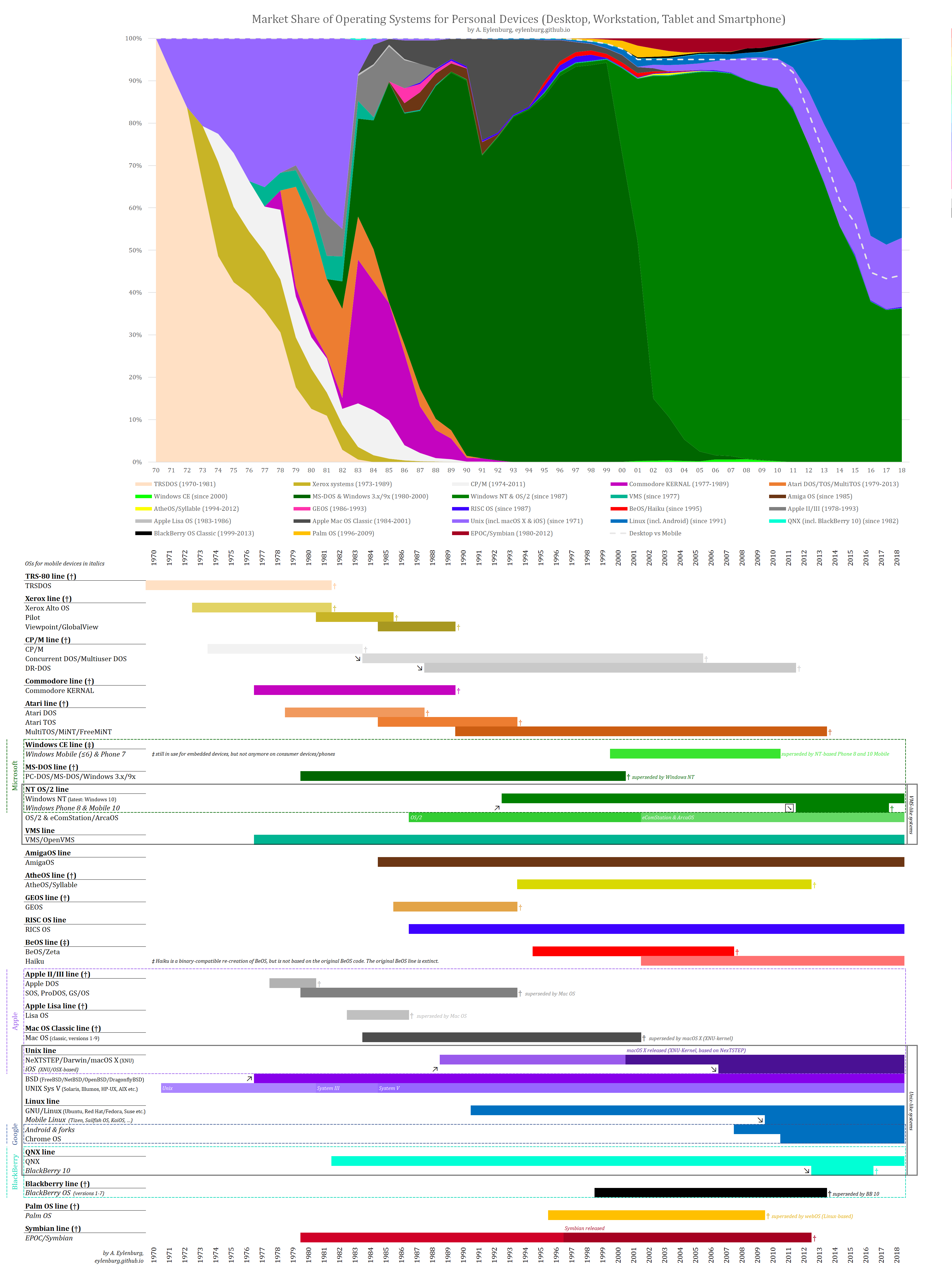 The below diagram shows the historical market shares of operating systems across personal devices (meaning "workstations", "PC", desktops, laptops, tablets and smartphones, but excluding for example servers). At the bottom you will see a short genealogy of the major "consumer" operating systems. Many historical operating systems families are long dead, some other are somehow still alive but barely so or have stopped not targeting the personal computing or workstation market anymore.