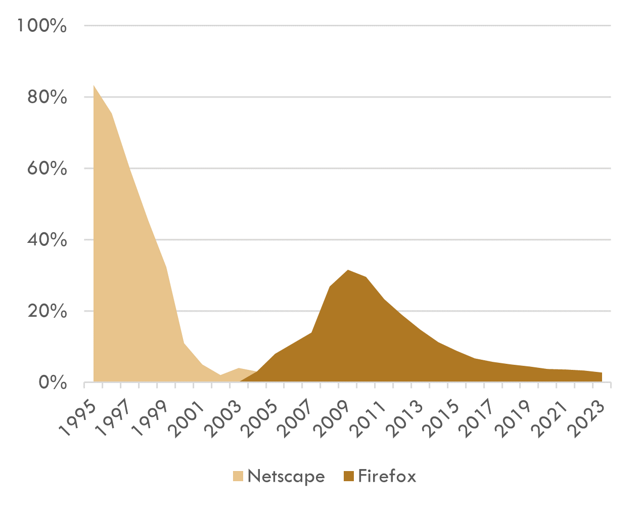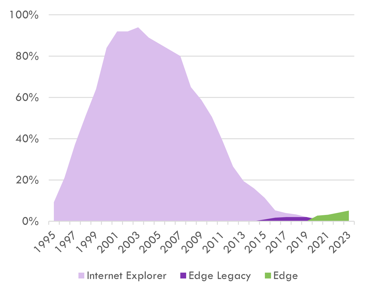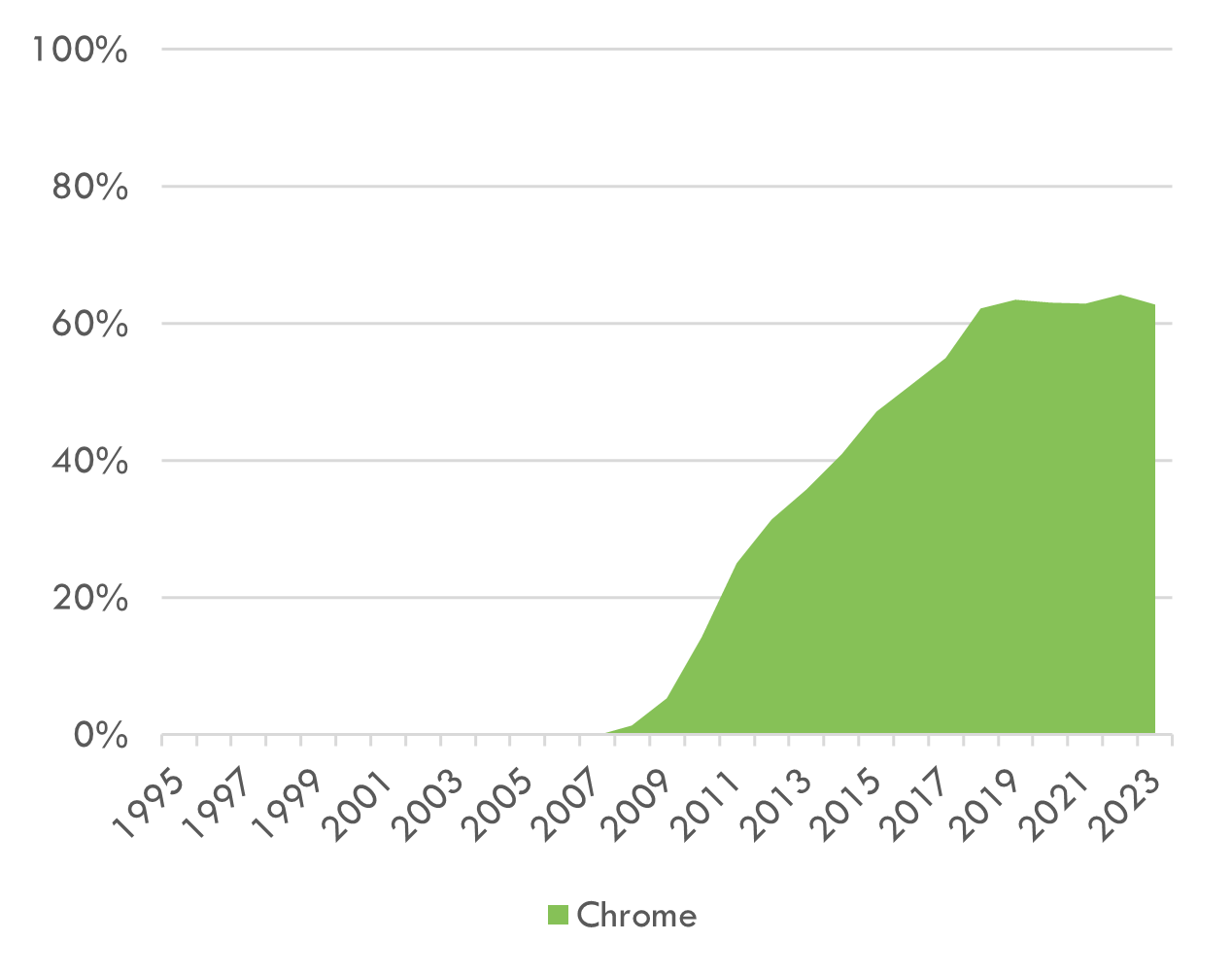 Usage share over time • worldwide • all device types included • source: TheCounter 2002-07, StatCounter 2008-23 |