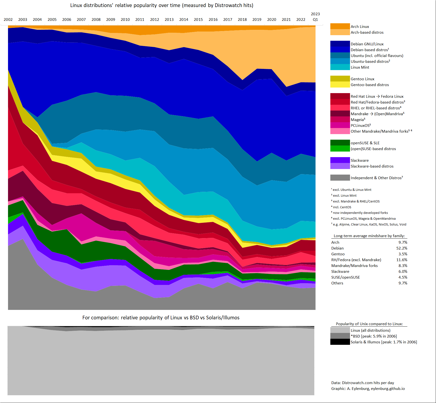The graph below shows the relative amount of hits on Distrowatch for the different Linux distributions, grouped by larger distro families and ancestries. The data is available for 2002-2023Q1. As well all know, Distrowatch hits are NOT a reliable indicator for the market share - just think of the mysterious #1 position of MX Linux - but nevertheless it's quite interesting to see how things have changed over time. The greater Debian family now dominates, although Arch-based distros have also recently gained a lot of popularity. At the same time, Gentoo, Slackware, (open)SUSE, Red Hat/Fedora and Mandriva have lost in the Distrowatch rankings compared to the early 2000s.